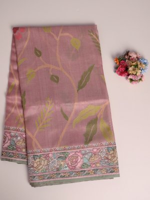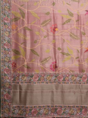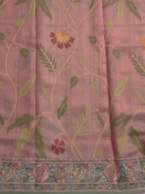 This stunning Banaras Tussar Jamdani silk saree in a soft dusty peach tone exudes refined grace and artistic beauty. The saree body is intricately detailed with vibrant floral motifs in hues of light green, deep green, soft orange, red, and yellow, creating a lively yet elegant appeal. Its shadow work embroidered border, adorned with delicate multi-colored hand embroidery, adds depth and a touch of handcrafted luxury. Complemented by a contrasting dusty green striped blouse, this ensemble beautifully balances tradition with modern charm.