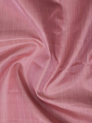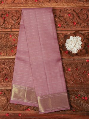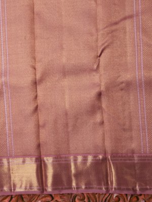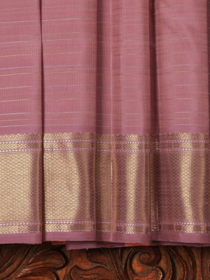 This handwoven kanjeevaram silk saree features a shade of dusty pink and gold and silver stripes all over the body. It is paired with a gold Zari border.
