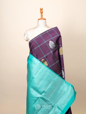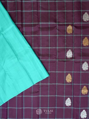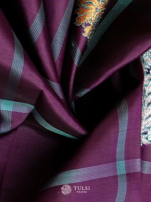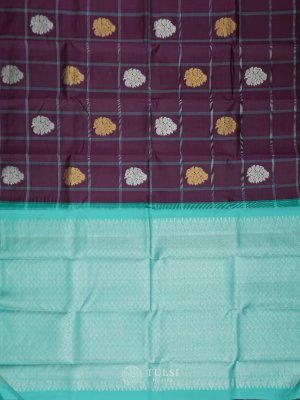Dark Maroon Checked Threadwork Kanjeevaram Silk Saree