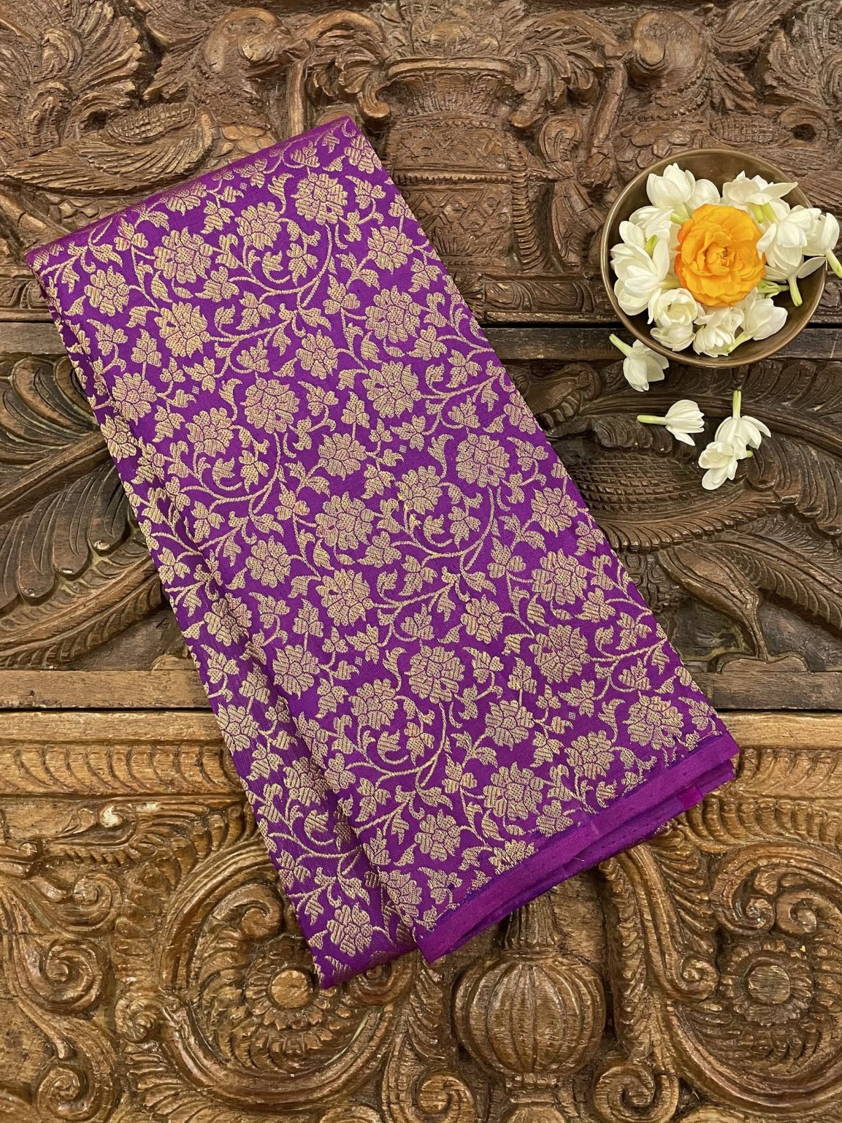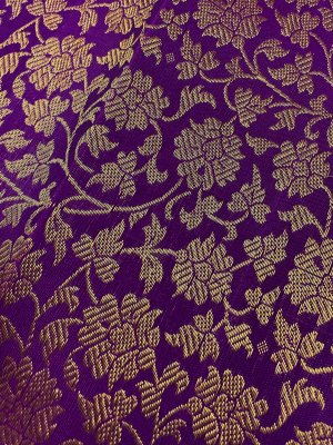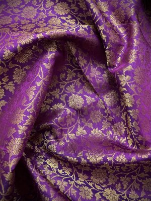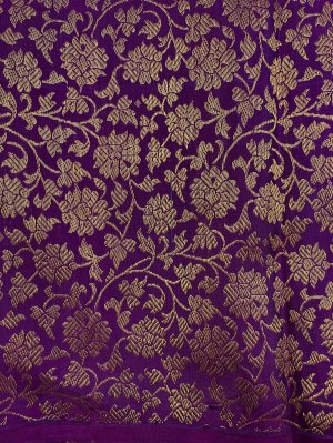 This handwoven purple Kanjeevaram silk blouse is adorned with elaborate floral gold zari brocade all over.
