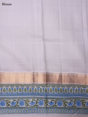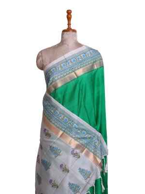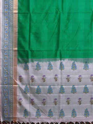 This Emerald Green Soft Silk saree showcases a lustrous, fine-grained body texture that drapes with fluid grace and a lightweight feel. The structural integrity of the white border is reinforced by a metallic gold zari band and intricate floral block prints in sky blue and leafy green. A striking white pallu completes the ensemble, detailed with rhythmic botanical motifs and delicate hand-knotted tassels for a refined, artisanal finish.