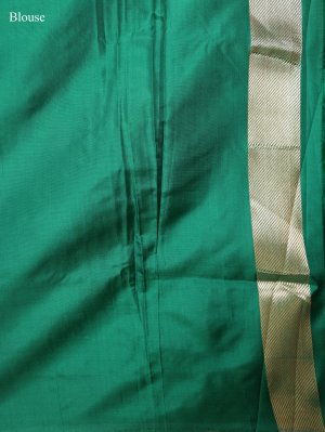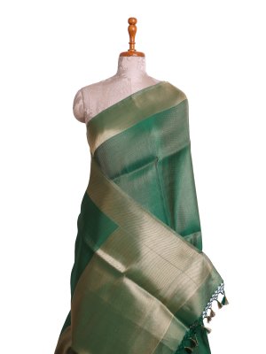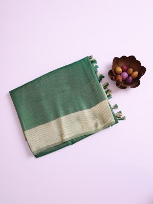 This Emerald Green Mashru silk saree features a deep, jewel-toned body etched with intricate zig-zag weaving that produces a shimmering, multifaceted appearance. The thick metallic border transitions into a decorative pallu accented by delicate silken tassels, offering a heavy, luxurious fall suitable for wedding guests. A coordinated green blouse ensures a polished and statuesque look, highlighting the impeccable craftsmanship of the dense, lustrous silk.