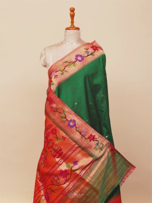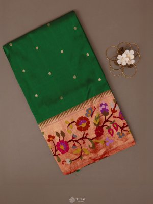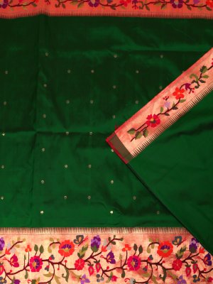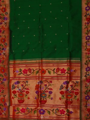 This Emerald Green Paithani Silk Saree captures the essence of traditional Maharashtrian craftsmanship with its vibrant body and exquisitely woven border. The saree features a rich Paithani border adorned with colorful floral and vine motifs, adding a lively yet regal touch. Subtle buttas on the body enhance its elegance, while the lustrous silk drape gives it a luxurious finish.