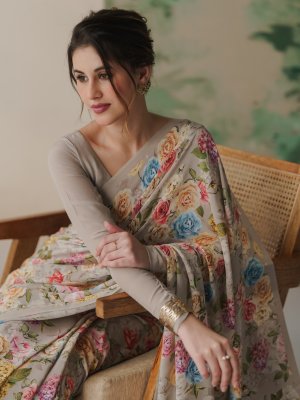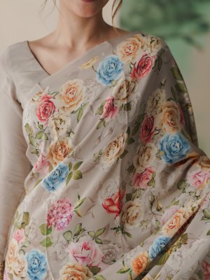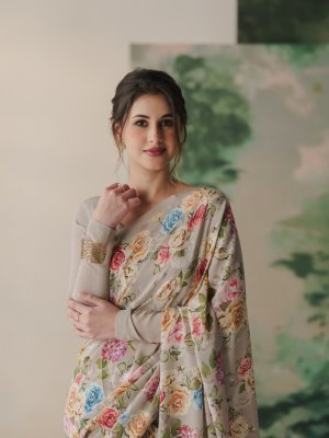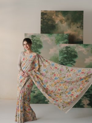 This pure silk crepe collection redefines everyday luxury with its fluid drape and refined floral digital prints. Lightweight yet indulgent, the silk crepe lends a natural elegance, while the prints add a fresh, contemporary touch. Timeless, versatile, and effortlessly chic, these sarees are made for modern wardrobes.
