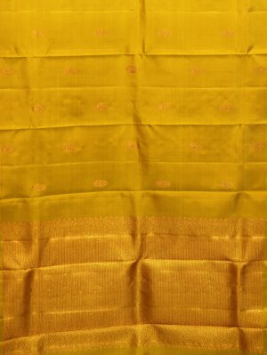 This Greenish Yellow Kanjeevaram Silk Dupatta features an exquisite play of shimmering zari buttas across a radiant sun-drenched field. The intricate temple-inspired borders and traditional tassels offer a majestic finish, perfect for elevating high-end ethnic ensembles with timeless South Indian luxury.