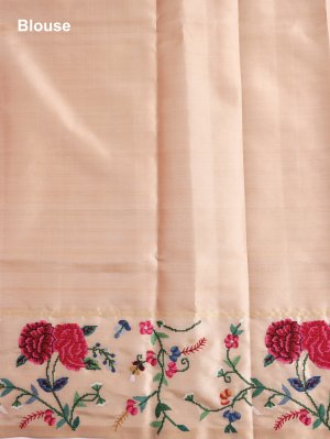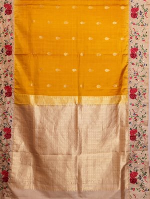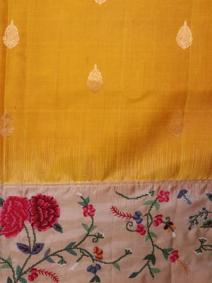 This stunning soft silk saree showcases a radiant yellow body highlighted with classic gold zari butta for a touch of tradition. The beige contrast border is exquisitely detailed with colourful cross stitch embroidery, blending red, pink, maroon, pastel green, yellow, off white, and blue in artistic harmony. The vivid border adds depth and character to the drape. Paired with a matching beige pallu and blouse, it offers a perfect balance of elegance and vibrance.