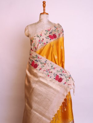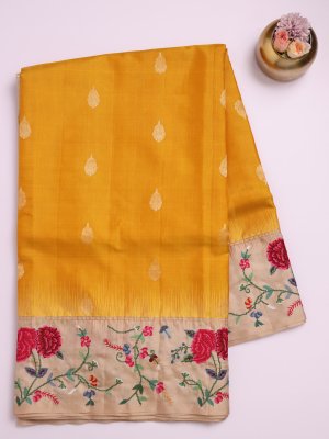 Yellow Banaras Silk Saree With Shadow Embroidered Border