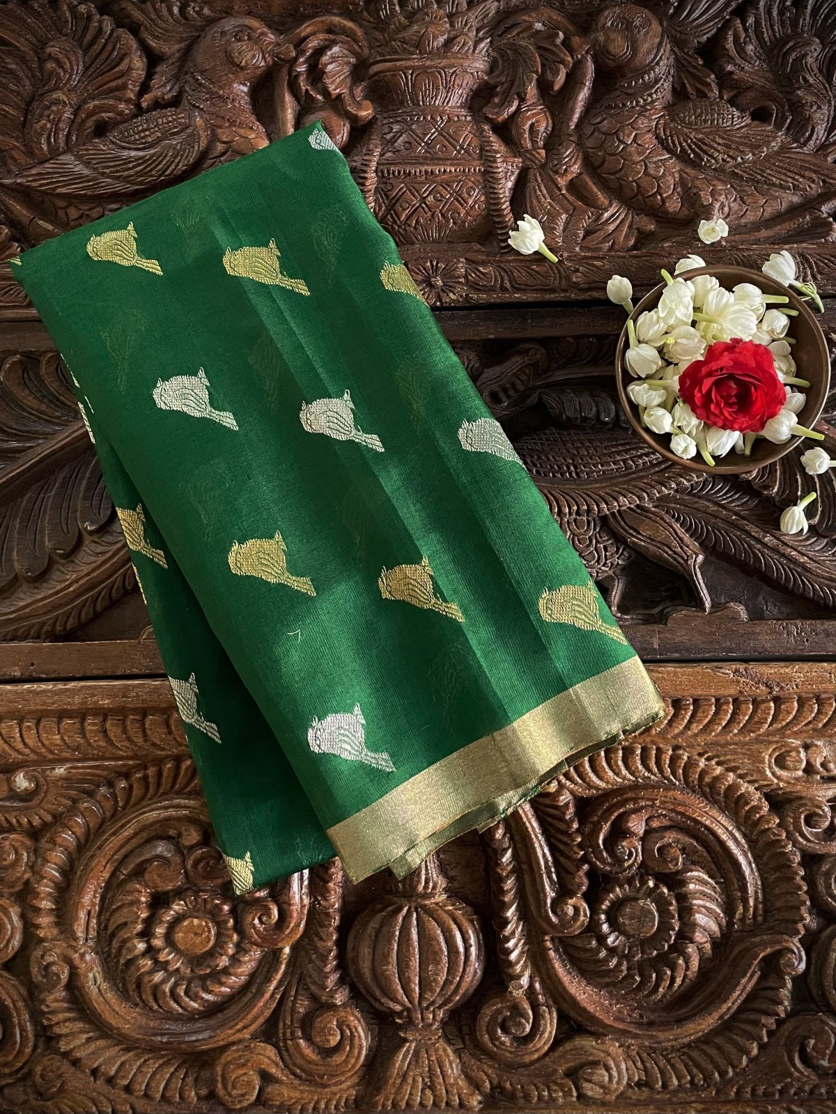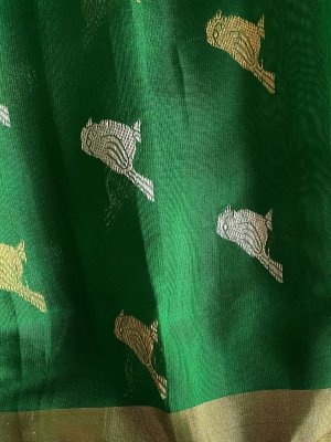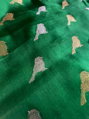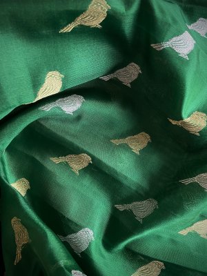 This Handwoven Green Chanderi Silk Blouse is embellished with gold and silver zari bird motifs accompanied by gold borders.