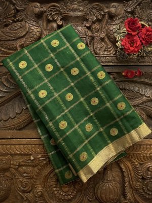 This Handwoven Green Chanderi Silk Blouse is embellished with gold zari checks and motifs accompanied by gold borders.