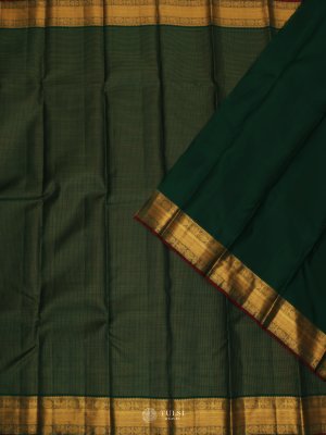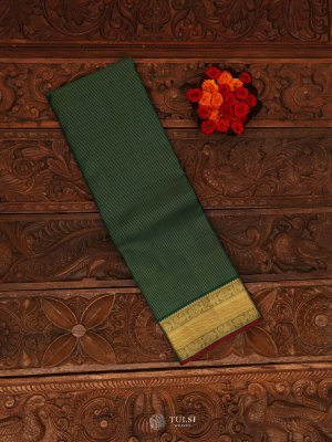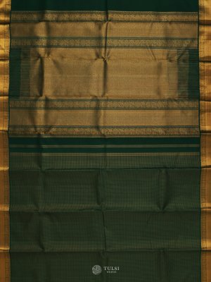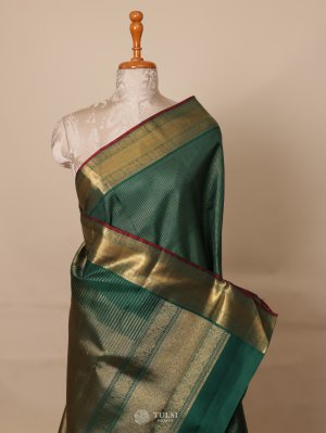 This Green Kanjeevaram Silk Saree with rich golden zari work, The deep peacock blue hue symbolizes elegance and grace, while the traditional golden borders and pallu often feature motifs like peacocks, temples, or floral patterns.