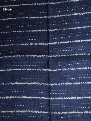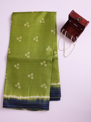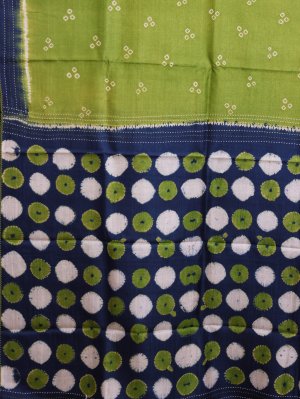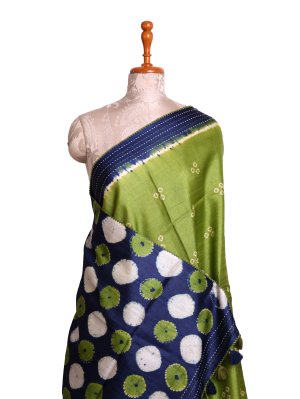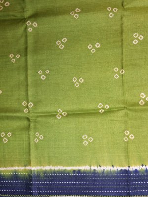 This Mehndi Green Printed Tussar Silk Saree features a vibrant body adorned with intricate Bandhini work and delicate Kantha embroidery over the Border. The design is framed by a striking Dark Navy Blue border and a contrasting pallu showcasing artistic white and green tie-and-dye patterns. Complete with a Navy Blue Shibori blouse featuring matching Kantha details, this ensemble perfectly blends traditional Indian craftsmanship with modern elegance.