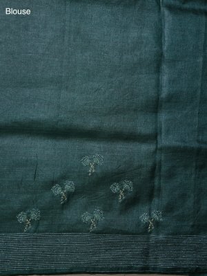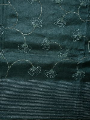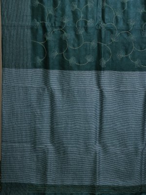 This green tussar silk saree is a canvas for heritage. Every inch features meticulous Kantha embroidery, where delicate hand-stitched motifs tell a story of timeless craftsmanship. The raw, organic texture of the silk meets the sophistication of artisan needlework, making it a standout choice for high-profile gatherings and festive celebrations alike.