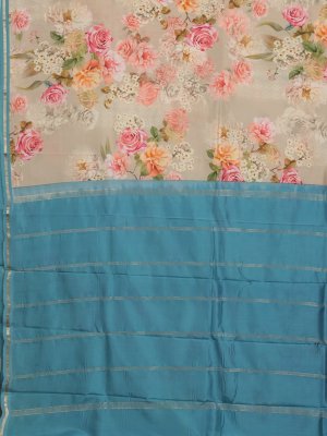 This Greige Kanjeevaram silk saree is adorned with delicate floral prints in pinkish-orange, peach, soft yellow, and green, giving it a graceful and feminine charm. The light blue border provides a subtle contrast, enhancing its elegant appeal. Woven from rich silk, it drapes beautifully with a luxurious sheen. Perfect for festive occasions or traditional celebrations, it blends timeless craftsmanship with contemporary colors.