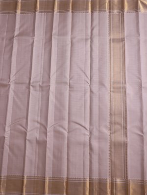 This Greige Silk Dhoti and Vastram set features a sophisticated neutral tone, a lustrous silk finish, and an intricate gold zari border. The body is defined by elegant horizontal zari stripes that add a rhythmic texture and a subtle shimmer to the muted earthy hue. This set offers a contemporary evolution of South Indian heritage, ensuring a polished, high-end look for weddings and formal events.