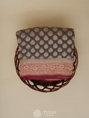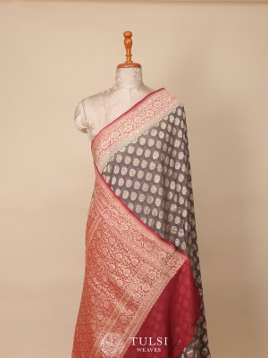 This graceful grey Banarasi georgette silk saree is adorned with large floral butis, adding a touch of elegance. The delicate light pink border enhances its charm, creating a perfect blend of sophistication and tradition.