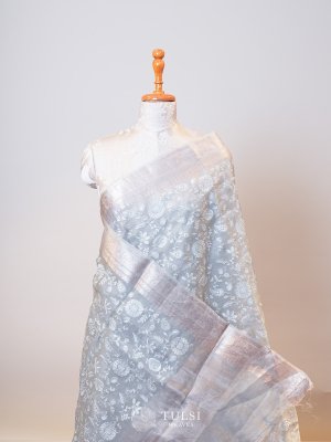 Draped in ethereal charm, this Grey Organza Silk Saree evokes a sense of enchantment with its delicate beauty. Adorned with intricate floral embroidery gracefully scattered across the body, it exudes timeless elegance. Paired with a self-border that adds a touch of subtle sophistication, this saree is a true epitome of grace.