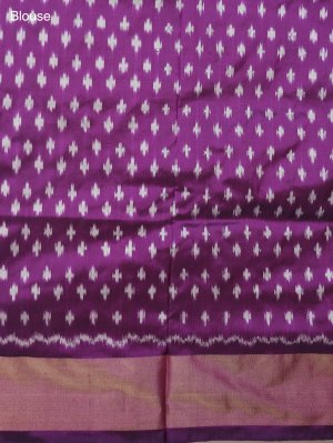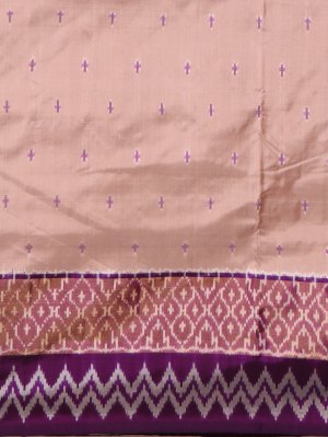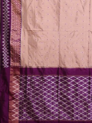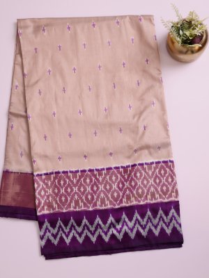 This elegant beige silk saree is adorned with intricate purple motifs scattered across the body for a refined, textured finish. The focal point is a majestic bottom border where a rich zari base serves as a shimmering canvas for detailed purple pattern work. It is a masterclass in contrast, balancing understated slate tones with the opulent, light-catching brilliance of royal purple.