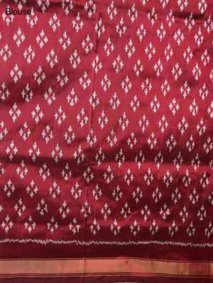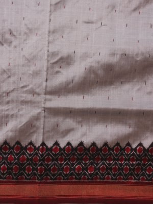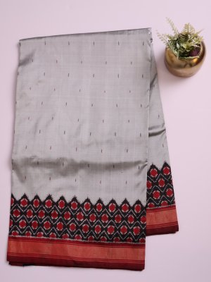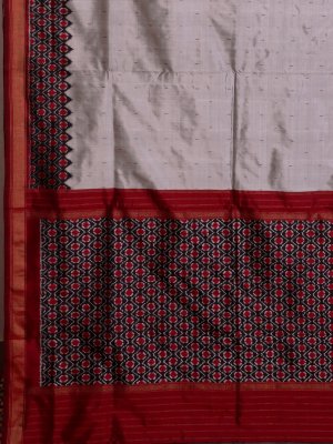 This grey ikat silk saree with a red border features a solid zari finish. The body showcases delicate all-over Ikat patterns in red and black, enhanced by a bold red and black block design above the border. Perfectly blending traditional craftsmanship with contemporary elegance, this saree is ideal for festive occasions and celebrations.