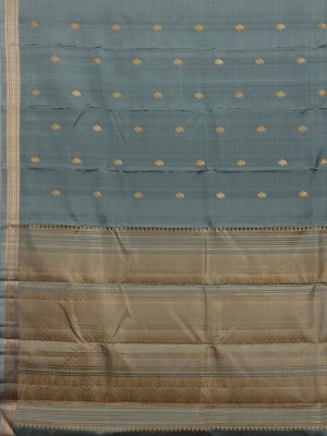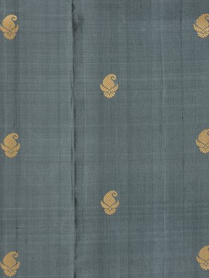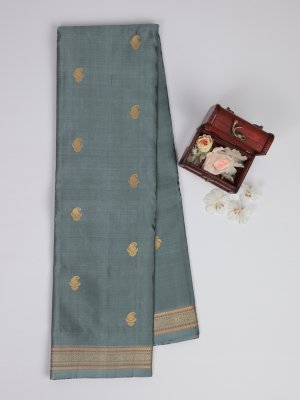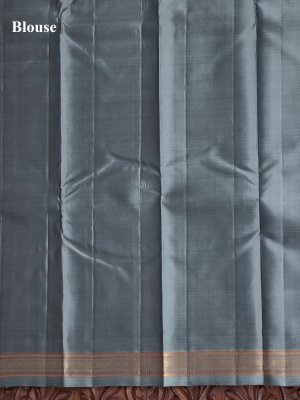 A masterpiece in grey, this Kanjeevaram Pattu Silk Saree is adorned with fine paisley buttas across the body, beautifully contrasted by a soft sandal hue. Its border features a vibrant mix of orange and beige intricate patterns, adding depth and charm. The pallu stands out with grand paisley motifs intertwined with detailed design patterns, making it an exquisite choice for festive and ceremonial wear.