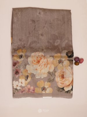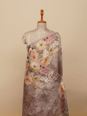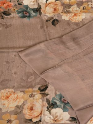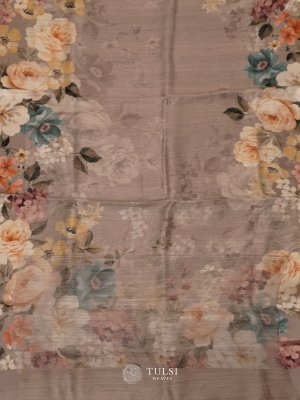 This Greyish Brown Matka Tussar Silk Saree features a beautifully soft, textured drape enhanced with delicate floral prints along the borders. Its subtle sheen and lightweight feel make it perfect for both festive and formal occasions. The refined colour palette adds timeless charm, making it a versatile addition to any wardrobe. A sophisticated blend of tradition and contemporary style.