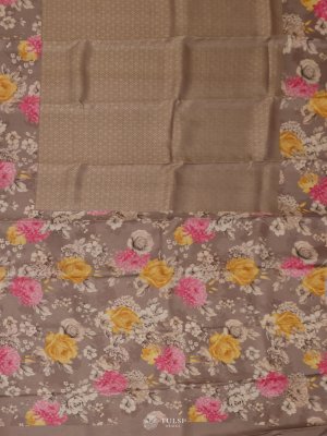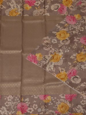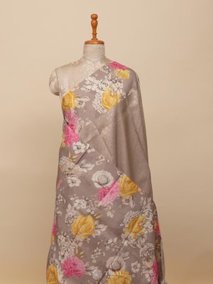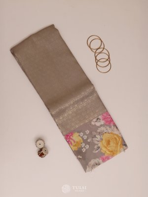 This Grey Printed Kanjeevaram Silk Saree features a stunning floral design in vibrant hues of yellow, pink, and white. The soft grey base beautifully highlights the intricate floral prints, lending a modern yet timeless elegance. The saree is complemented by a rich, subtly shimmering Kanjeevaram-style border that adds a touch of grandeur.