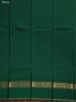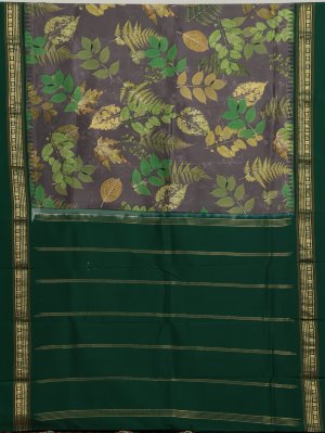 This graceful grey printed Kanjeevaram silk saree features nature-inspired eco-style prints in refreshing green shades across the body, creating a soothing and contemporary appeal. The soft grey base beautifully highlights the leafy motifs, giving the saree an earthy yet sophisticated look. A rich bottle green zari border adds classic contrast, woven with traditional finesse that elevates the overall charm. Perfect for those who love a blend of modern aesthetics with timeless Kanjeevaram elegance.