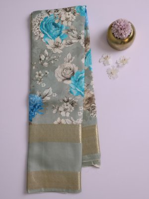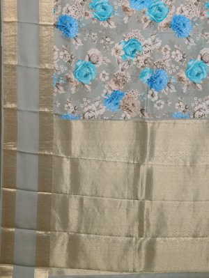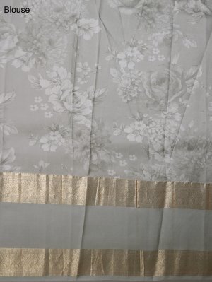Grey Printed Kanjeevaram Silk Saree With Self Zari Border