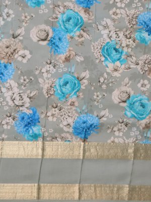 Grey Printed Kanjeevaram Silk Saree With Blue Border