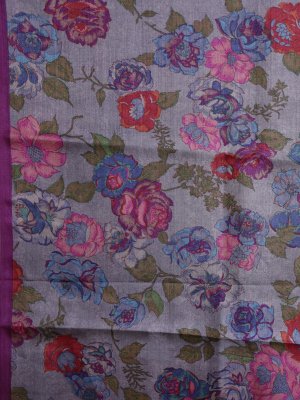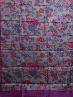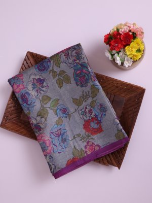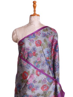This elegant grey printed Tussar Silk saree showcases a beautiful blend of subtle sophistication and vibrant charm. The soft grey base is adorned with intricate floral prints in shades of pink, blue, and hints of red, creating a lively yet graceful look. The saree is highlighted by a rich purple border that adds a striking contrast and enhances its overall appeal. The natural texture of Tussar silk gives it a slightly crisp feel with a gentle sheen, making it perfect for both casual gatherings and semi-formal occasions. Its artistic floral pattern and refined color palette make it a timeless and versatile dra