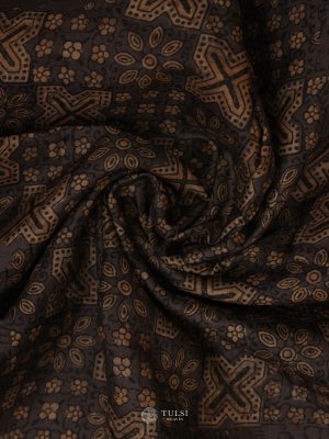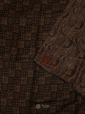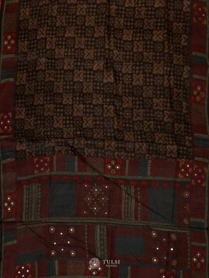 This Brown Tussar Silk Saree is adorned, creating a beautifully textured look. The pallu and borders feature striking geometric and floral detailing in mustard, green, and red, adding vibrant contrast. The soft silk fabric offers a graceful, fluid drape, while the rich detailing lends a refined touch of traditional artistry.