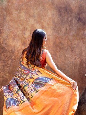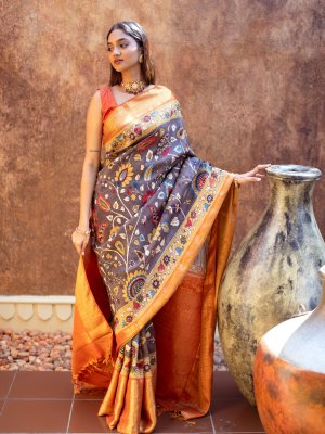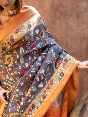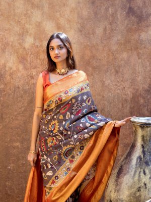 This handwoven Kanjeevaram silk saree has a greyish brown, hand-painted Kalamkari body that is adorned with enchanting Kalamkari patterns. It is paired with an orange korvai border that is embeliished with pure gold zari detailing.