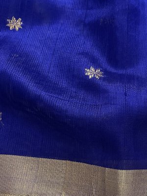 This Handwoven Ink Blue Silk Blouse is embellished with gold zari floral detailing accompanied by gold borders.