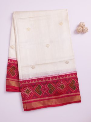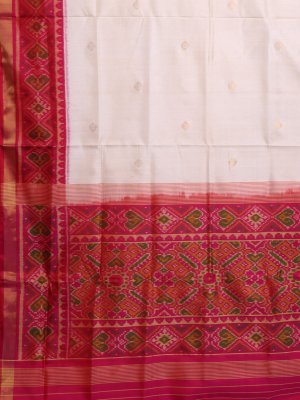 Discover the elegance of this Ivory Patola silk saree, featuring a minimalist body beautifully contrasted by a vibrant pink Zari border. The pallu showcases masterfully woven motifs in rich pink hues with contemporary sophistication. Perfect for weddings and festivities, this artisanal creation offers a refined drape that celebrates heritage craftsmanship.