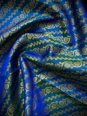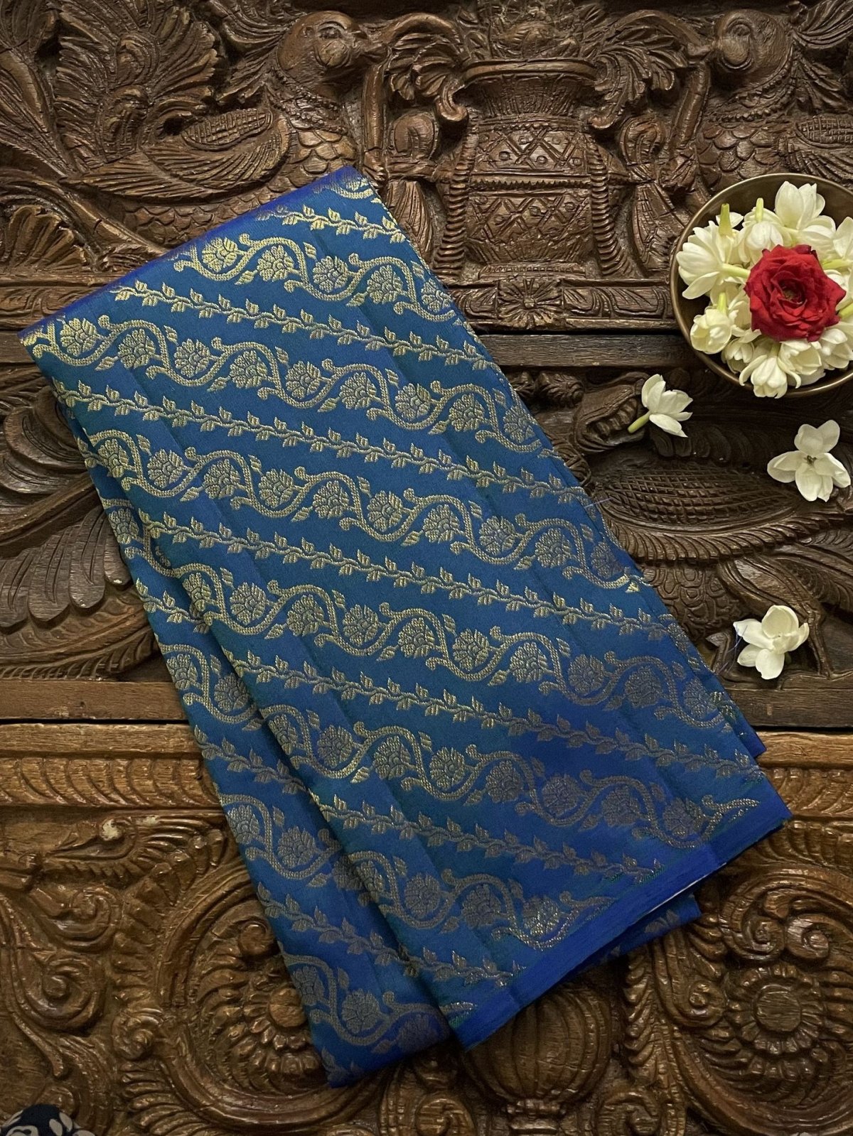 This handwoven blue Kanjeevaram silk blouse is adorned with elaborate floral gold zari brocade all over.