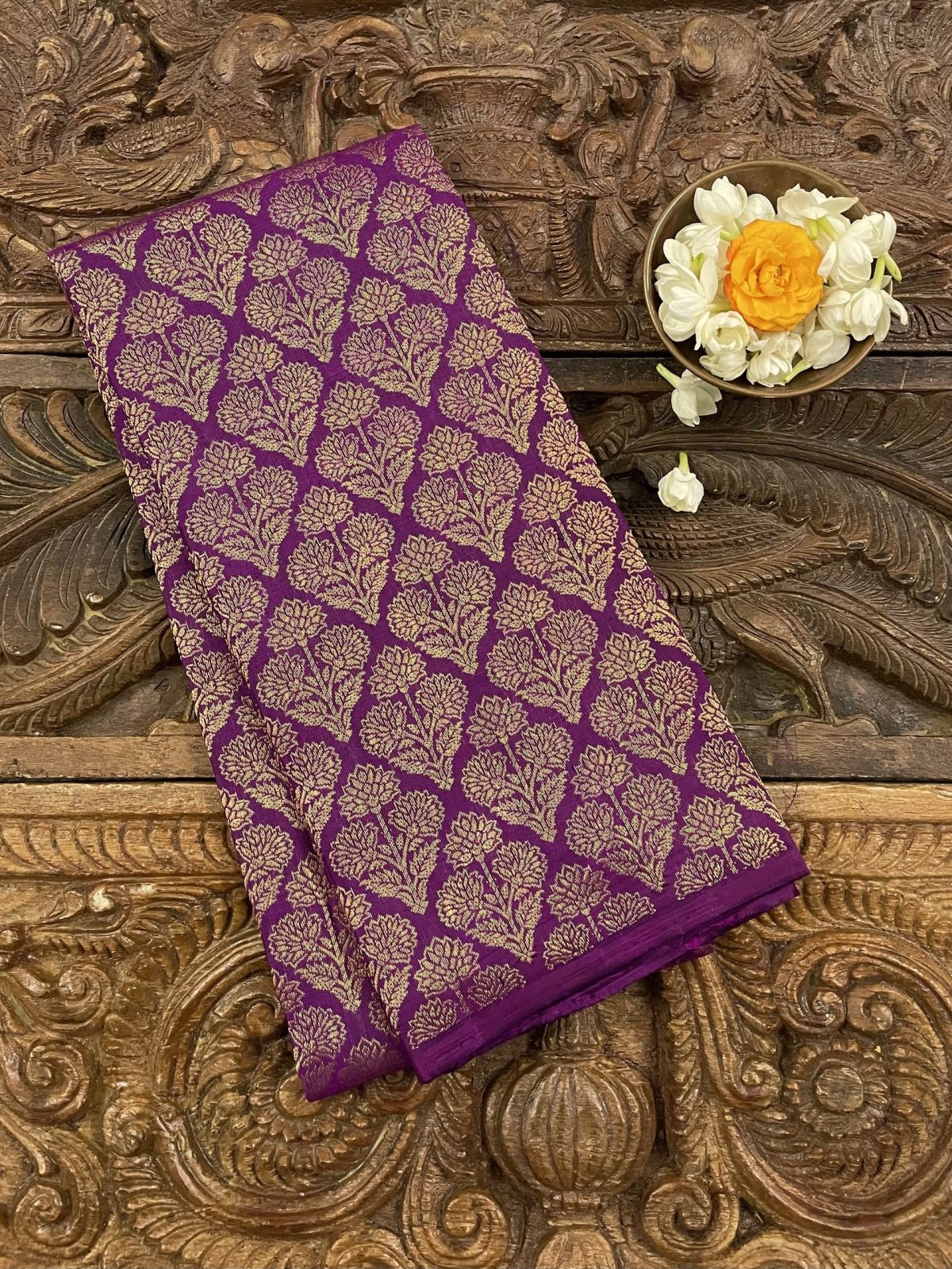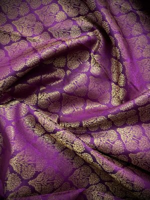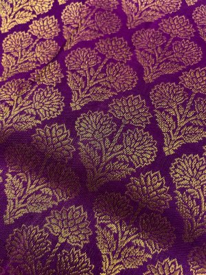 This handwoven purple Kanjeevaram silk blouse is adorned with elaborate floral gold zari brocade all over.