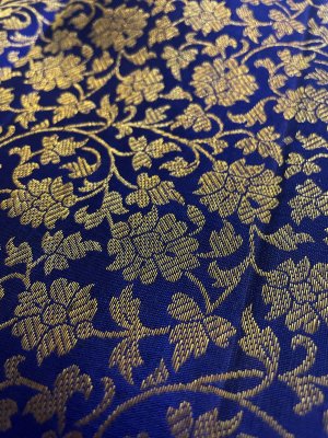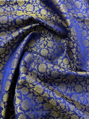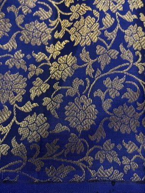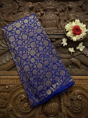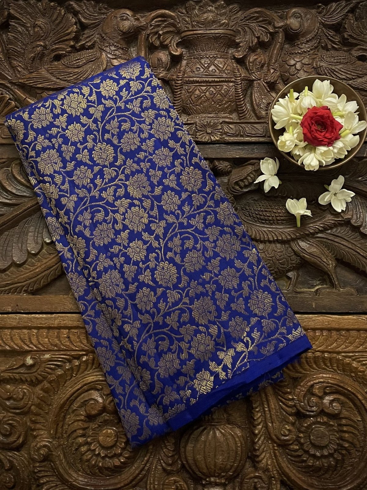 This handwoven dark blue Kanjeevaram silk blouse is adorned with elaborate floral gold zari brocade all over.