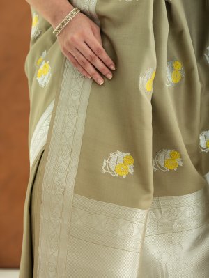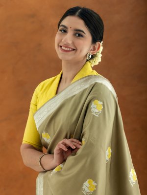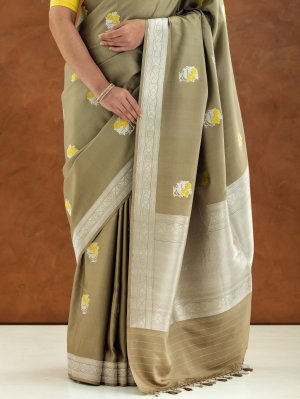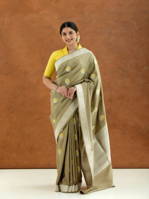 This Khaki Mashru silk saree features an elegant Floral buttis throughout the body. The saree is beautifully framed with a self-zari border, offering a perfect blend of tradition makes the perfect choice for weddings and special occasions