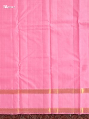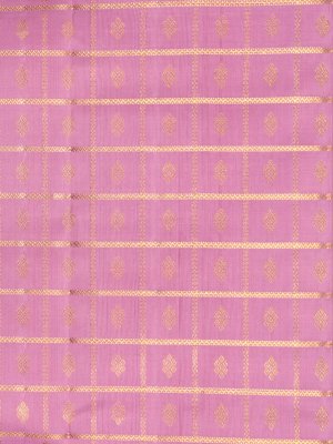 This lavender Kanjeevaram silk saree showcases a graceful zari checked pattern that reflects classic South Indian artistry. The soft light pink contrast border features traditional retta pettu zari, lending a rich and elegant finish. The body is enhanced with shimmering zari checks complemented by subtle kamalam butta motifs. An exquisite choice that blends heritage craftsmanship with refined sophistication for special occasions.