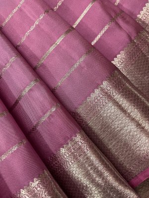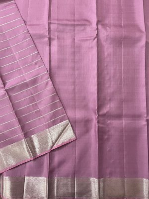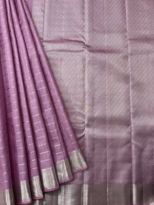This handwoven lavender kanjeevaram silk saree has pure silver zari veldhari woven all over. It has a self border adorned with elaborate silver zari detailing and a pink selvedge.