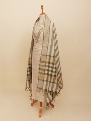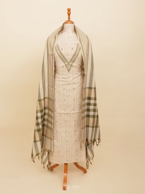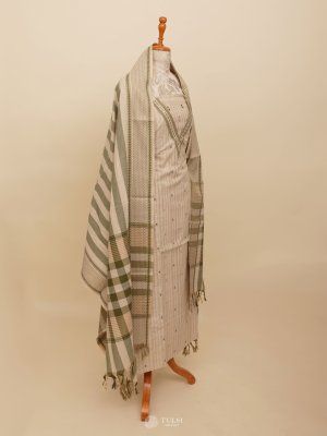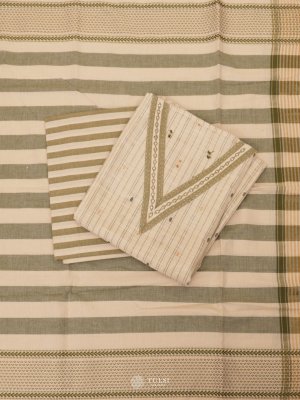 This elegant Light Beige Cotton Salwar Material, featuring light green subtle stripes on the body for a touch of texture and charm. Crafted from breathable, soft cotton, this unstitched suit material ensures all-day comfort—perfect for casual wear, office use, or summer outings.