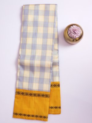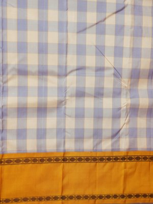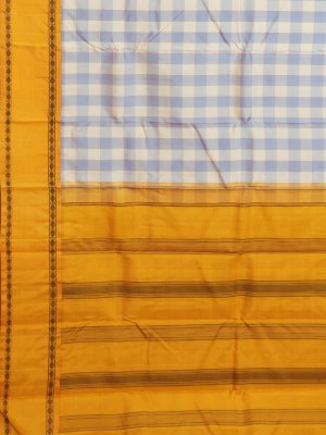 Light Blue & Cream Checked Kanjeevaram Silk Saree with Golden Yellow Border