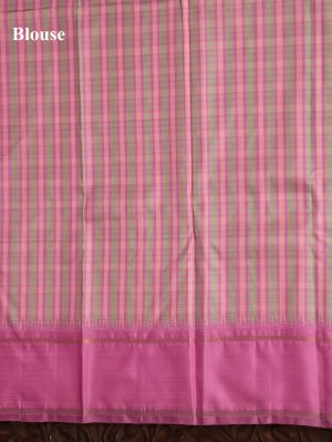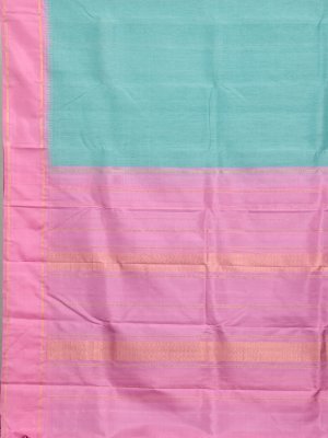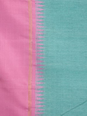 This light blue Kanjeevaram linen saree features a graceful plain body highlighted with a striking contrast pink border. The border is enriched with traditional Pillaiyar temple motifs and elegant zari lines that reflect timeless South Indian craftsmanship. The soft linen weave gives the saree a delicate sheen and an effortless drape. A vibrant multi-colour check blouse adds a contemporary twist while maintaining tradition. Ideal for weddings, festive occasions, and cultural celebrations.