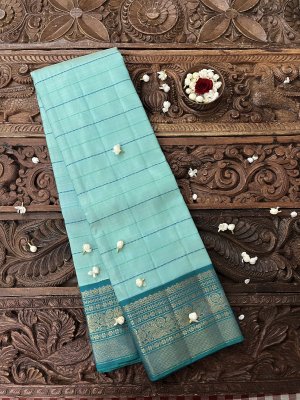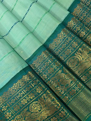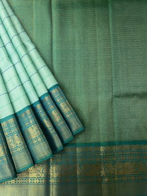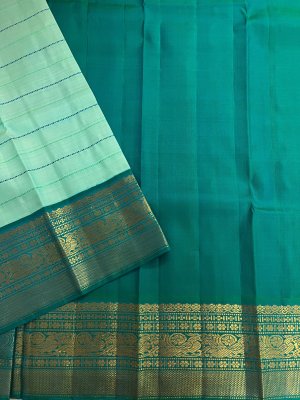 This handwoven light blue Kanjeevaram korvai silk saree has green and blue veldhari detailing woven all over the body. It is paired with an exquisite aquamarine blue border with mayil motifs in pure gold zari.