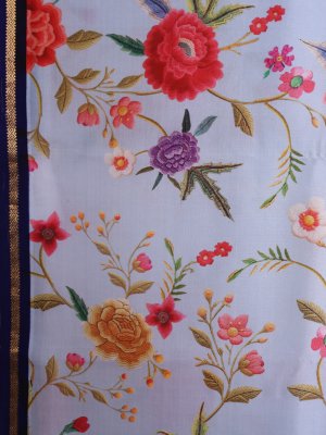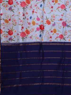 This stylish saree features a light blue body decorated with large, colorful floral prints in red and pink. The bottom part is a contrasting dark blue with simple diagonal gold lines. A thin gold border runs along the edge, making the whole design look neat and modern. It is a perfect choice for someone who wants a fresh, trendy look with a touch of tradition.