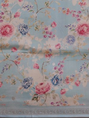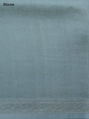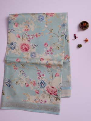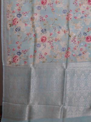 This light blue printed tussar georgette silk saree features a plain blouse that perfectly complements its intricate design. The saree’s border and pallu are richly adorned with elegant zari work, adding a luxurious sheen. Delicate floral prints enhance its graceful appeal, making it an exquisite choice for special occasions.