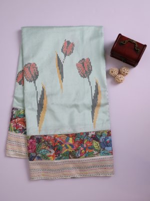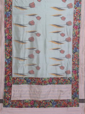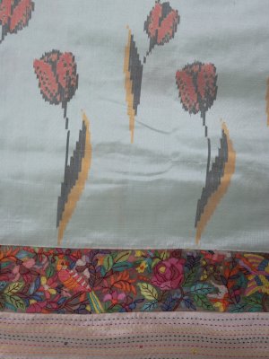 This Light Bluish Green Patola Silk saree features a graceful body detailed with vibrant tulip motifs in shades of orange, yellow, and black. The inner border showcases intricate multicolor shadow embroidery of flowers, birds, and lush foliage, framed by an elegant off-white outer border featuring delicate stripes of Kantha embroidery. The pallu is beautifully finished with a combination of detailed shadow work and textured Kantha stitch detailing for a refined look.