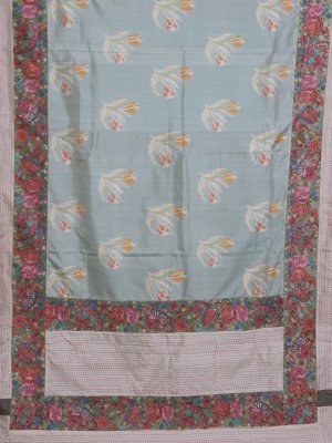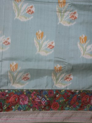 This Light Bluish Green Patola Silk saree features a sophisticated body adorned with vibrant tulip motifs in shades of orange and red. The ensemble is defined by an off-white outer border and an inner border showcasing exquisite multicolor shadow embroidery of flowers and butterflies. Its magnificent pallu blends artistic shadow work with stripes of Kantha embroidery and a clean off-white finished edge for a timeless appeal.