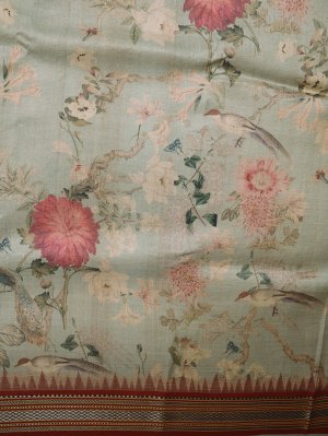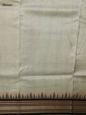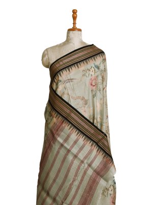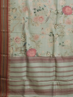 This Light Bluish Grey Tussar Silk Saree features a lustrous, rippled texture across the body, meticulously printed with vibrant floral blooms and elegant bird motifs. The contrasting Red and Black Ganga Jamuna Vidarbha border displays temple-inspired geometric patterns that transition smoothly into the main fabric. A coordinated pallu finished with bold red horizontal stripes provides a clean, balanced conclusion to the length.