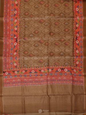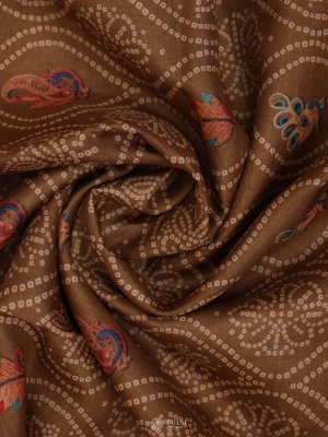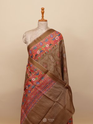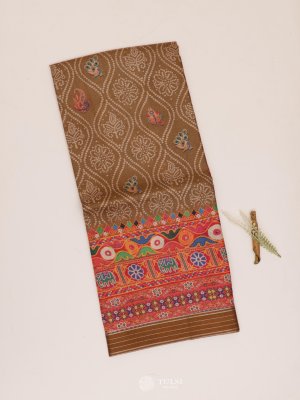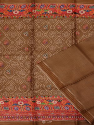 This Light Brown Printed Tussar Silk Saree showcases a refined printed design highlighted by intricate motifs arranged in neat, all-over patterns. The saree features a beautifully crafted border adorned with traditional floral and ornamental detailing, adding richness and depth to the overall look. Its pallu carries fine woven accents that enhance its classic appeal. Soft, lightweight, and gracefully textured.