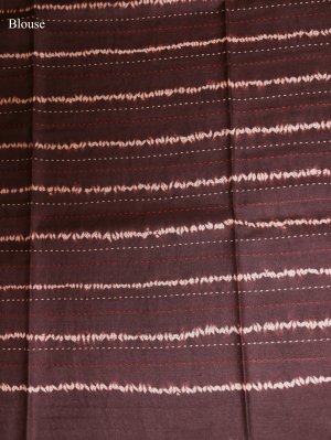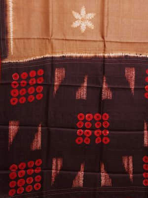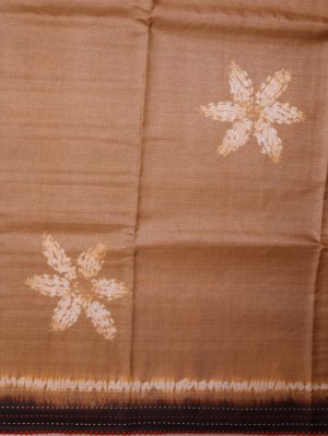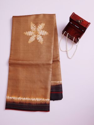 This Light Brown Printed Tussar Silk saree features a minimalist body adorned with delicate white star-shaped Shibori motifs. The striking dark brown pallu is intricately detailed with vibrant red circular patterns and geometric Kantha embroidery accents. Finished with playful tassels, this ensemble combines traditional craftsmanship with a contemporary Aesthetic.